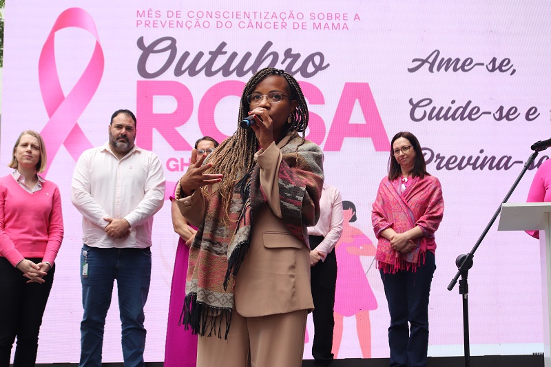 O evento, realizado no pátio em frente ao hospital, começou com a apresentação do Coral da Associação dos Servidores do Grupo Hospitalar Conceição (Aserghc). Após o concerto, foi realizada a abertura oficial, com a presença da diretoria da instituição. A diretora de Inovação, Gestão do Trabalho e Educação do GHC, Quelen Tanize Alves da Silva, também paciente da Mastologia, compartilhou sua experiência de descoberta e tratamento do câncer de mama no HNSC, seus medos e expectativas, destacando o atendimento de excelência e humanizado das equipes. “O GHC tem um grande capital, que é seus trabalhadores”, afirmou.