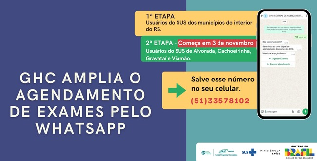 Começou nesta segunda-feira, 3 de novembro, a segunda etapa do agendamento virtual de exames, por meio do WhatsApp, nos hospitais Conceição e Criança Conceição. Agora, além dos usuários procedentes de municípios de fora da Região Metropolitana de Porto Alegre, os usuários de Alvorada, Viamão, Gravataí e Cachoeirinha poderão agendar seus exames nestes hospitais pelo WhatsApp, número (51) 3357-8102.