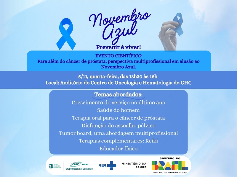 Ocorre, nesta quarta-feira, 5 de novembro, o evento científico “Para além do câncer de próstata: perspectiva multiprofissional em alusão ao Novembro Azul”. A série de palestras será realizada das 13h30 às 18h, no Auditório do Centro de Oncologia e Hematologia do Grupo Hospitalar Conceição (COH), localizado na esquina das ruas Francisco Trein e Umbu. Os interessados devem se inscrever pelo link clicando aqui para participar.