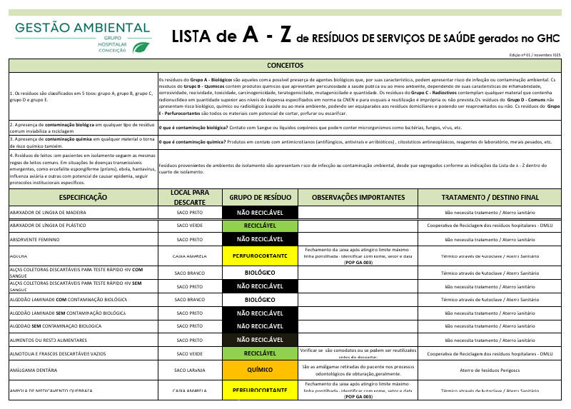 Com o objetivo de orientar os funcionários e promover a padronização no descarte de resíduos de serviços de saúde e de fortalecer a cultura de sustentabilidade social e ambiental, a Gestão Ambiental e o Controle de Infecção do Grupo Hospitalar Conceição (GHC), elaboraram a “Lista de A-Z de Resíduos de Serviços de Saúde”.