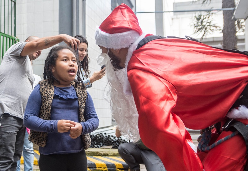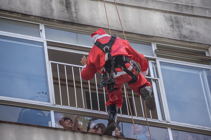 Pacientes, familiares e trabalhadores do Hospital Criança Conceição (HCC) receberam, nesta quinta-feira (11), a visita do Papai Noel e de quatro super-heróis. A turma, que participa das atividades festivas de fim de ano do Grupo Hospitalar Conceição (GHC), desceu de rapel pelos cinco andares do prédio, fazendo a alegria de quem estava no pátio e nos corredores. A ação é um trabalho voluntário da empresa Vértice, que já presta serviços para a instituição.