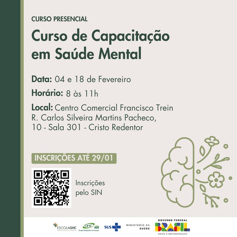 O Grupo Hospitalar Conceição (GHC) está promovendo um curso de capacitação em Saúde Mental, na modalidade presencial, com o médico psiquiatra Luiz Ziegelmann. As inscrições já estão abertas e vão até o dia 29 de janeiro. O curso ocorrerá no período da manhã, das 8h às 11h, nos dias 4 e 18 de fevereiro, no Centro Comercial Francisco Trein, Rua Carlos Silveira Martins Pacheco, 10, sala 301, Bairro Cristo Redentor.