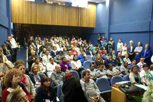O Coral do GHC brindou os convidados com cânticos populares. Voluntários também participaram do evento, distribuindo fôlderes informativos à comunidade nas recepções e em frente ao Hospital Conceição.