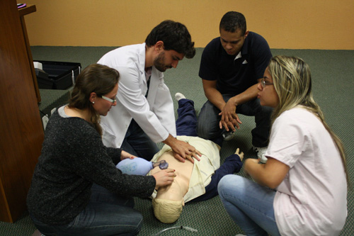 Nesta terça-feira, 7 de maio, o auditório do Hospital Cristo Redentor recebeu a equipe de bucomaxilofacial do Grupo Hospitalar Conceição, que orientou residentes e estagiários, ensinando-os como realizar a reanimação cardiorrespiratória em um paciente que chega na emergência. Durante o procedimento, os alunos tiveram a oportunidade de praticar a manobra de reanimação em um boneco fictício, além de utilizar ferramentas reais de trabalho.