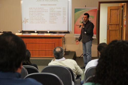 Os 12 integrantes da Junta Recursal eleitos pelos trabalhadores do GHC e os 12 indicados pela Diretoria serão responsáveis pelos recursos das avaliações individuais dos funcionários do GHC. O coordenador da Junta Recursal, Edenilson da Silva, apresentou uma síntese dos recursos de 2012 a 2014 para que os novos membros saibam quais foram os resultados da Junta até o último mandato.