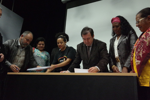 A diretoria do Grupo Hospitalar Conceição assinou o Pacto pelo Fim do Racismo Institucional na última sexta-feira, 27 de junho, no auditório do Instituto da Criança com Diabetes. O GHCé a primeira instituição no Rio Grande do Sul a aderir ao Pacto Estadual pelo Fim do Racismo Institucional, O documento, organizado pela Comissão Especial de Políticas de Promoção da Igualdade Racial do GHC, tem por objetivo identificar e propor medidas para eliminar práticas de racismo na instituição. Participaram da cerimônia de assinatura do documento o diretor-superintendente do GHC, Carlos Eduardo Nery Paes, o diretor técnico do GHC, Paulo Bobek, o diretor administrativo e financeiro do GHC, Gilberto Barichello, o auditor do Ministério da Saúde no Rio Grande do Sul, Stênio Dias Pinto, a diretora do Departamento de Ações em Saúde do Estado, Károl Veiga Cabral, a coordenadora da Saúde da População Negra do Estado, Miriam Cristiane Alves, a integrante da Frente Parlamentar de Combate ao Racismo da Assembleia Legislativa Ivonete Carvalho, a coordenadora do Conselho de Participação e Desenvolvimento da Comunidade Negra do Rio Grande do Sul, Elis Regina Vargas, e a coordenadora da CEPPIR/GHC, Ludmila Marques.