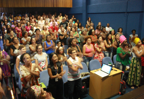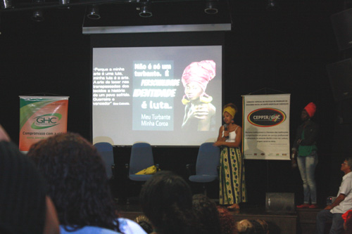As convidadas Vanessa Silva e Malizi Fontoura ministraram a oficina “Oluchi: a arte da resistência, resiliência e reconciliação através dos turbantes”, contextualizando a origem do uso desse adorno e, após, colocando os turbantes nas mulheres da plateia.