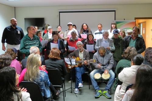 O grupo musical Tocante, formado por usuários e trabalhadores do Centro de Atenção Psicossocial Álcool e Drogas III do GHC, iniciou os trabalhos do evento com muita música, em apresentação ao vivo.