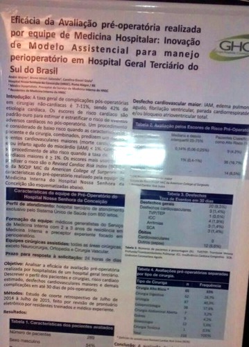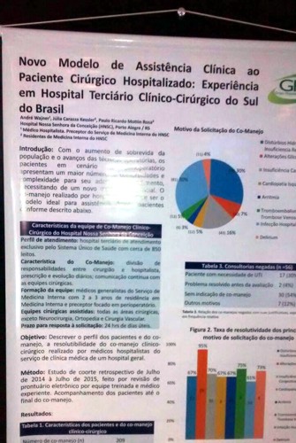 Na ocasião, dois trabalhos de equipes do GHC foram apresentados na sessão pôster. Os trabalhos são “Novo Modelo de Assistência Clínica ao Paciente Cirúrgico Hospitalizado: Experiência em Hospital Terciário Clínico-Cirúrgico do Sul do Brasil”, de autoria do médico hospitalista e preceptor do Serviço de Medicina Interna do Hospital Conceição, André Wajner, e dos residentes de Medicina Interna do HNSC Júlia Carazza Kessler e Paulo Ricardo Mottin Rosa; e “Eficácia da Avaliação Pré-operatória Realizada por Equipe de Medicina Hospitalar: Inovação de Modelo Assistencial para Manejo Perioperatório em Hospital Geral Terciário do Sul do Brasil”, também de autoria do médico André Wajner e dos residentes de Medicina Interna do HNSC Bruno Hirsch Salomão e Carolina Giesel Grala.